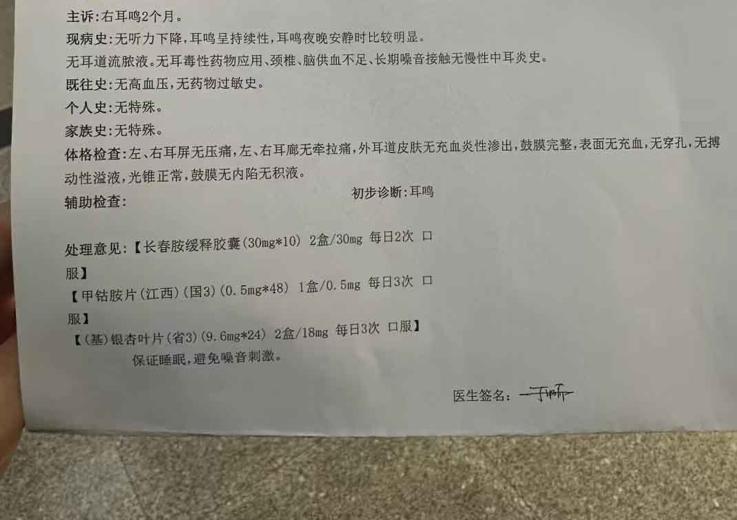 2014年的时候,我因为亲人患病去世,加上为了治病还债一天打3份工,让我的身体严重超负荷,每天腰膝酸软、口干口苦,慢慢的耳朵里开始出现了蝉鸣声,没多久声音就越来越大,吵得心烦意乱,没法睡着。实在忍不住了,就去了医院,医生给检查过以后,说我得了神经性耳鸣,然后给开了甲钴胺、银杏叶片,还有一个胶囊,让我拿回去吃。